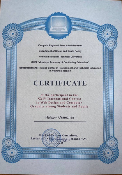 Вітаємо Найдича Станіслава, учня 9-Б класу який отримав сертифікат за участь у Міжнародному конкурсі веб-дизайну та комп’ютерної графіки, який проходив у місті Вінниця.