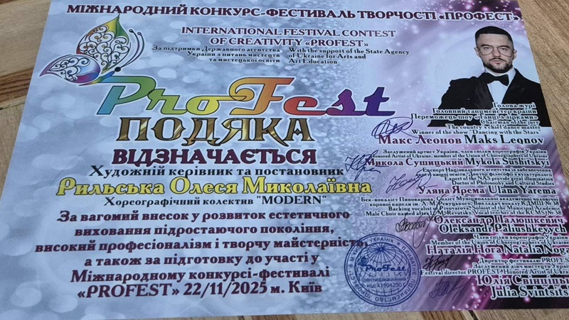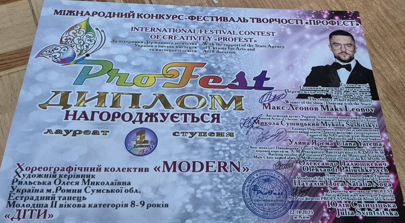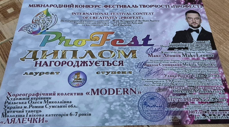 22.11. 2025 року в м.Києві, хореографічний колектив "MODERN" Роменського ліцей 1 ім.П.І.Калнишевського (керівник Олеся Рильська) взяв участь в МІЖНАРОДНОМУ КОНКУРСІ-ФЕСТИВАЛІ «ПРОФЕСТ»
